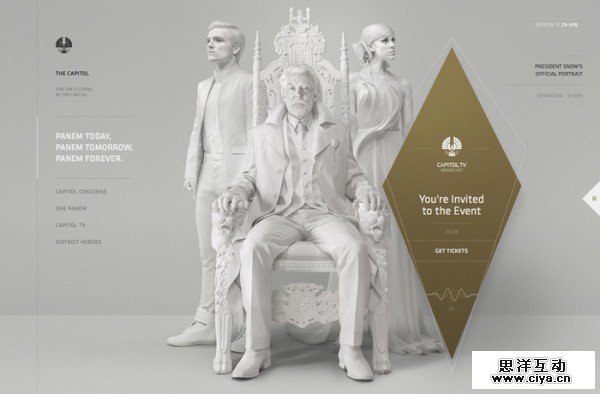 这个网站完全是基于近年比较火爆的《饥饿游戏》系列来制作的,网站风格冷峻,与网站残酷的调性非常一致。网站整体设计并不复杂,配色简单,但是风格简单而大胆,并且使用了视差滚动的设计。网站使用大量的信息、视频和其他内容让用户与之互动,让他们仿佛置身于电影当中。