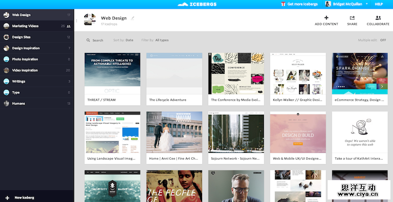 Icebergs是一款能帮你管理创意灵感的优质平台。它有点类似Pinterest和花瓣,但是相对更私密,并且更专注与策展和协作,而不是社交分享。你可以从网络的各个角落搜集各种文字、图片、视频,也可以从本地上传文件。没有信息干扰和信息污染,你可以在Icebergs上整理文件,寻找灵感,甚至为团队创建MoodBoards。