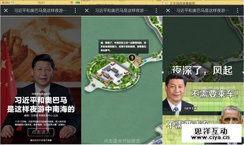 首先获此殊荣的是网易新闻中心的《习近平和奥巴马是这样夜游中南海的》。它是一篇“可视化”新闻,除了生动的图片,更多信息通过动画效果呈现出层次感和互动感,就像一个flash动画一样,把中美两位政治大佬的夜游中南海的信息传播得通通透透,各种场景切换,使读者如临其境、如见其人、如闻其声。
