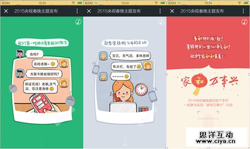 典型例证就是央视春晚的“家和万事兴”:“我们对世界微笑,彬彬有礼,却带着一身疲惫和抱怨回到家里;我们在外拼命售卖自己的观点,却懒得和父母解释我在忙什么(#讲真,内敛含蓄的小编听这台词肉麻兮兮的#)……”H5从一个与父母聚少离多的小故事讲起,通过催人泪下的文案和煽动人心的音乐引发共鸣,然后与“家和万事兴”的主题紧密贴合,最终号召网友“按手印”表达支持。