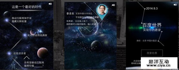 标杆案例如今年的百度世界大会,将会议邀请和星空元素紧密结合:在一片唯美的星空背景之上,每划过一道流星,就浮现出一位意见领袖对移动互联网的看法和愿景,最后是会议的时间地点,并可进行在线抢票。(#纳尼,又是百度的?!小编就不展开说了,夸那么多一分钱没收到何必呢?#)
