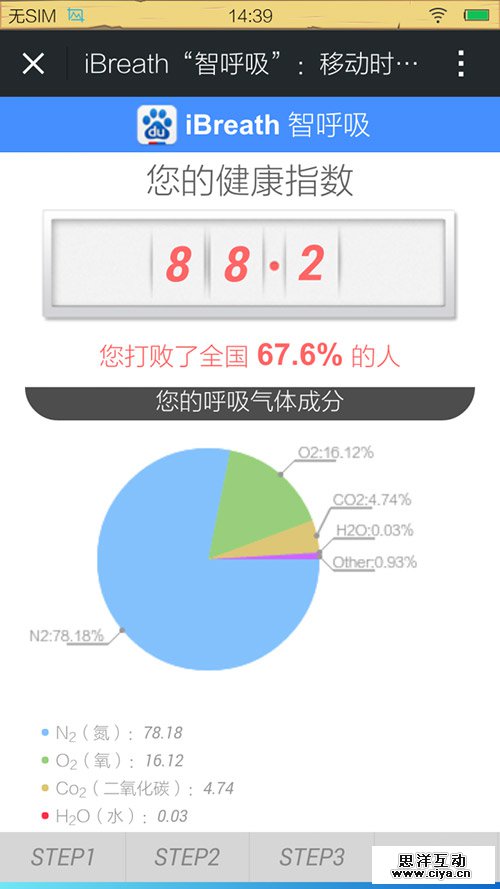 这是一款神奇的轻应用——你只要对着手机吹口气,就能知道自己的健康值(比孙悟空还厉害呢?):第一步,把手机水平放好(实际上是利用重力感应纠正手机平衡);第二步,深呼吸(#闭上你的眼睛,全世界有最清新洋气#);第三步,对着手机下方吹一口气。几秒钟后,你的健康值就出来了,同时附有这口气各种成分的数值,非常全面。