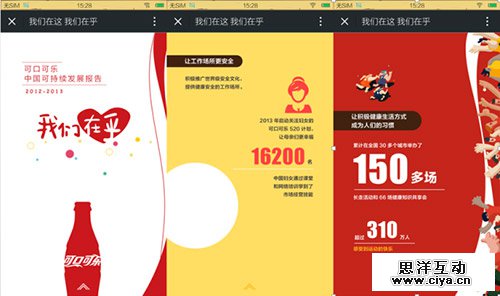 以前段时间席卷朋友圈的可口可乐“我们在乎”为例,它的真身本是一份肩负企业CSR重任的“可持续发展报告”,内容虽力求形象但扔难掩厚重。为了在社交时代更接地气,可口可乐尝试用H5为报告“瘦身美容”:选取报告中的部分核心数据,共十五页画面,直观展现可口可乐的努力,变成适应网络传播特点、特别是移动端观看及分享需求的形式。