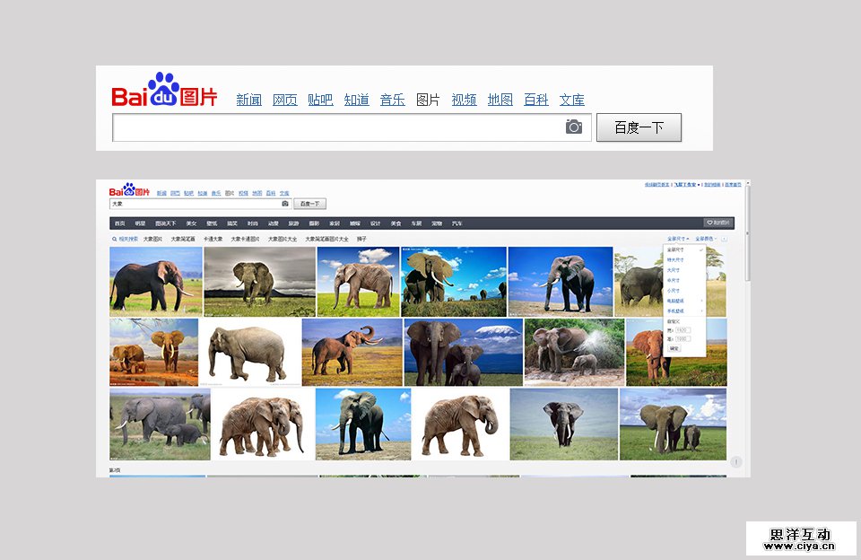 这是个快速的拿图技巧,比如,老板今天对你说,你去找一张大象的图片来,我想要产品介绍里放上这样的一个形象。这时,你打开google图片(现在需要翻墙)或百度图片,键入“elephant”,很快就会出现各种大象的图片,尺寸大小自由选择。缺点就是它的图片太庞杂,也没有经过筛选,你需要在一堆“杂货”中找到自己想要的好图也不是件容易的事。