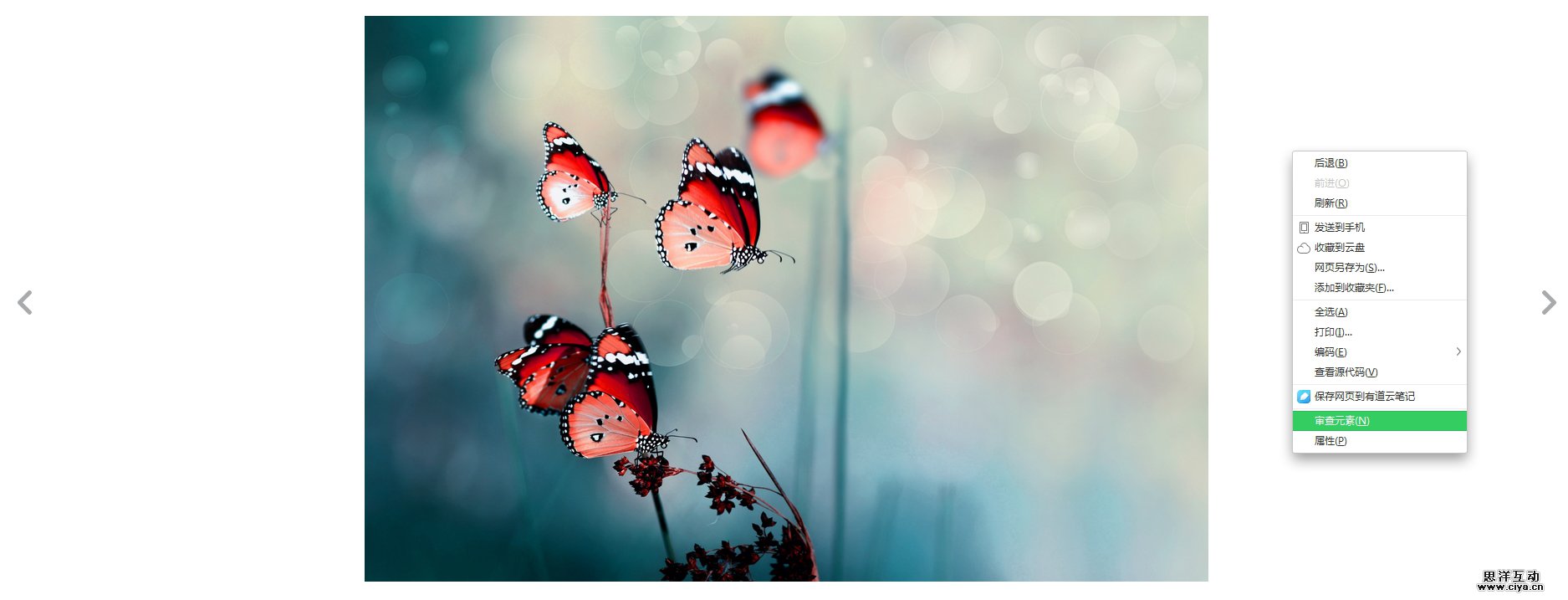 在图片以外的任意地方用鼠标右键点击后出现一个菜单,选择“审查元素”。