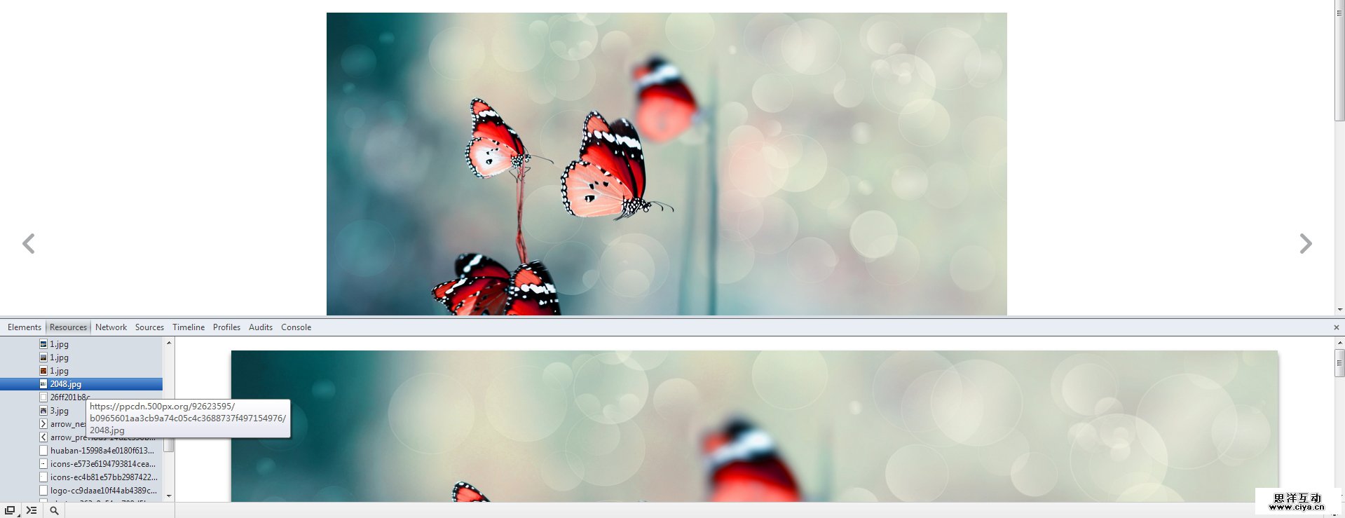 这时浏览器的下方会出现这样一个界面,在选项卡里选择“Resources”,在左侧的选项里再点选“image”,这时,这个网页里加载的所有image元素就被显示在这里了,你可以找到这张大图。