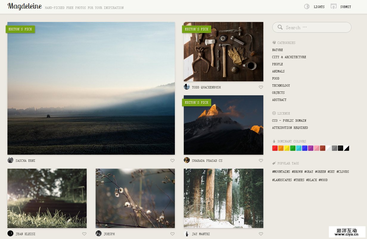 这是个自由主题的图片站,图片没有分类,也无法筛选,但是图片的格调和构图也十分有味道,如果有目的性的寻图可以忽略它,平时没事时可以当做欣赏一样去浏览和下载。