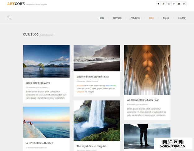Artcore 是一款总计包括12个页面的响应式HTML5网页设计模板。首页采用了清爽的配色,并结合典型的瀑布流设计。项目展示部分可以使用单栏,双栏和三栏式布局。