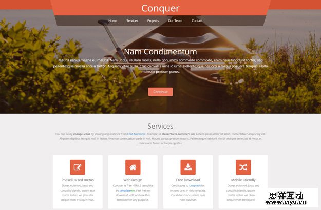 Conquer这款响应式网站模板基于Bootstrap V3.1.1来设计,适用于单页网站和滚动式布局。图片展示部分还包含了一个响应式图片展示工具lightbox。