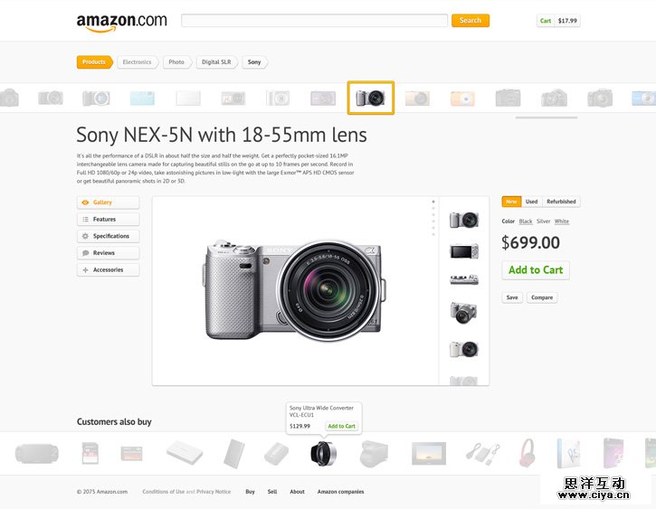 设计师Markin对Amazon的产品页面进行了重新设计,看起来非常漂亮!搜索到的产品缩略图在顶部,相关类似产品在底部。