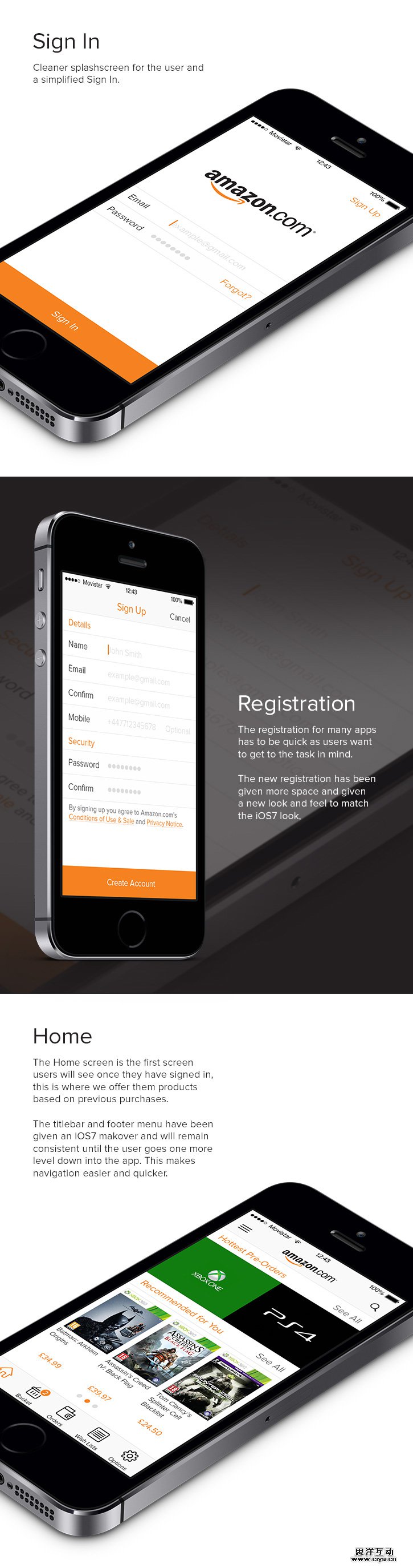 这是针对Amazon的iOS7客户端的深度修改,登录和注册更加渐变,留白的使用令页面更加整洁,其他的功能也进行了相当的优化。