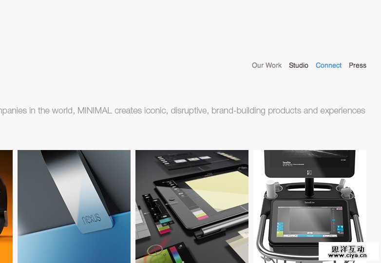 通常情况下,网站都会有个“Contact”页面,国内我们通常称之为“联系我们”。但是MINIMAL设计师工作室换了个思路,他们将这个常用的词改成了“Connect”,仿佛在说“来聊聊吧”。这是截然不同的感觉,传达出他们期待与用户沟通的强烈欲望。情怀?人性化。文案很重要。