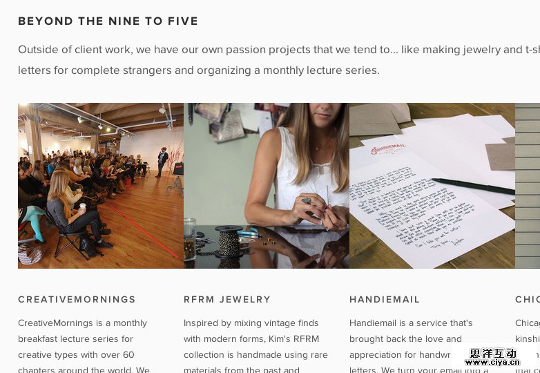 这是一个关于公司目标和员工的页面,其中写了他们的使命、愿景和目标。但是,不同于其他的类似设计,Knoed Creative通过这个“朝九晚五之外”的内容模块展示了员工工作之余的生活和经历,将这个公司多样化的一面生动地呈现了出来。