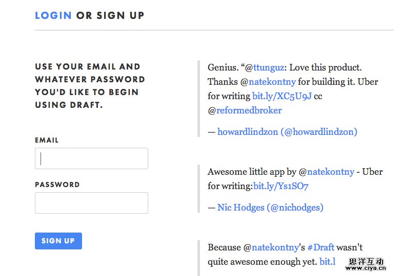 当我们讨论登录/注册页面的时候,可以轻松脑补出页面的造型——其实绝大多少的页面都差不多,本质上也就是个表单。但是有人并不打算随大流。曾经开发出著名应用Draft的Nathan Kontny,他在设计页面的时候,将用户的留言添加到表单右边,将互动与沟通的氛围呈现出来,吸引更多的潜在用户来注册。