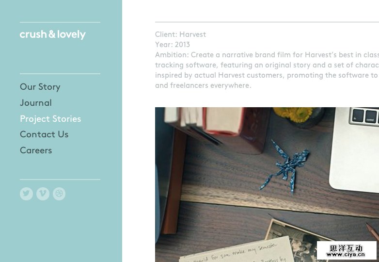 StudioCrush是一个用来展示各种项目故事的网站。网站将叙述方式简化了下来,每个项目本质上就是从开始(项目起源)到结束(项目交付)的过程,中间由关键的叙事线索(过程)桥接起来。