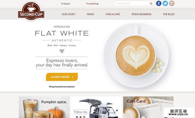 这个名为Second Cup 的网站整体配色走的浅色系路线,干净清爽的背景也使得网站的精心打磨的布局颇为突出,加上咖啡类网站必备的图章设计,从细节到氛围一次都搞定了~