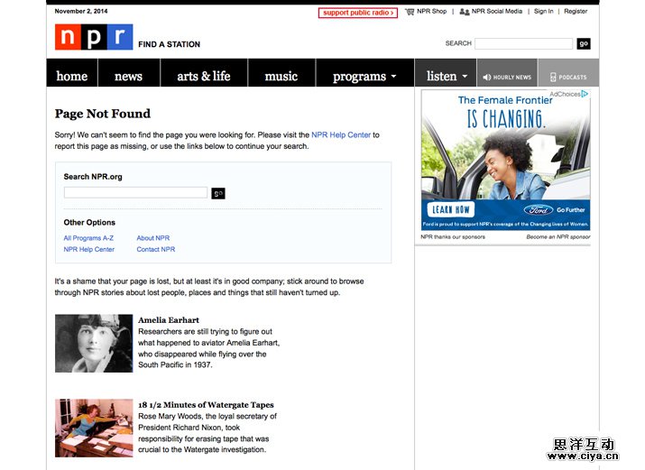 2. 搜索。在404错误页面上提供与网站其他部分相同(且位置一致)的搜索功能。这样一来用户就能自己查找要访问的页面。