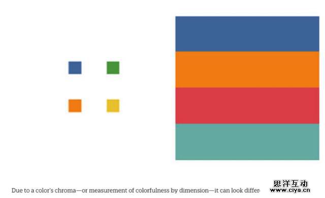“ 小尺度面积的颜色往往看起来不够多彩 ” S tone如是说。这里的变量是指颜色的色度,或色彩维度的评估。例如,一种电蓝色赛车条纹拥有高色度,而柔和的灰蓝色拥有低色度。当被用在小面积区域时,后者的色度需要被增强才能足够显眼地被区分。当大面积使用电蓝色时,需要稍微降低色度,才不会显得很扎眼。