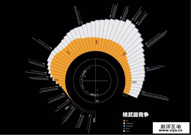 在调色板中为图表填色会引起镇静,也许在功能上数据可视化不一定比颜色差异性或语言关联性更重要。但是,把所有的因素考虑进去将帮助人们更容易地吸收和理解数据,Stone说。设计者或许会认为他们颜色的运用是毫无意义的,但是这会对读者理解数据产生情感方面的影响。看一下这幅关于近些年来世界上大量核武器的信息图。