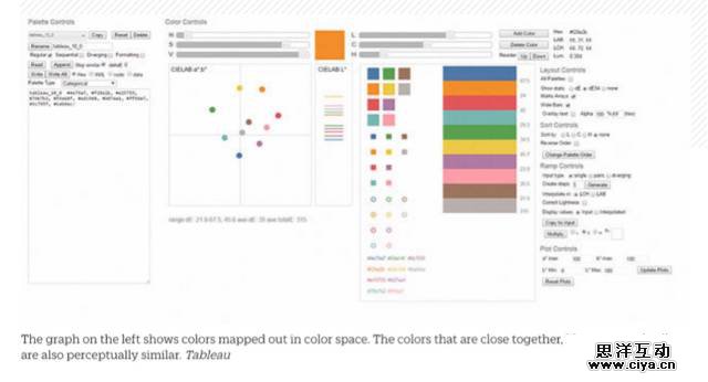 左边的图显示了在色彩空间中的标出的颜色,那些颜色相近的颜色,比如绿色和黄色,在感官上也是相似的。 --Tableau