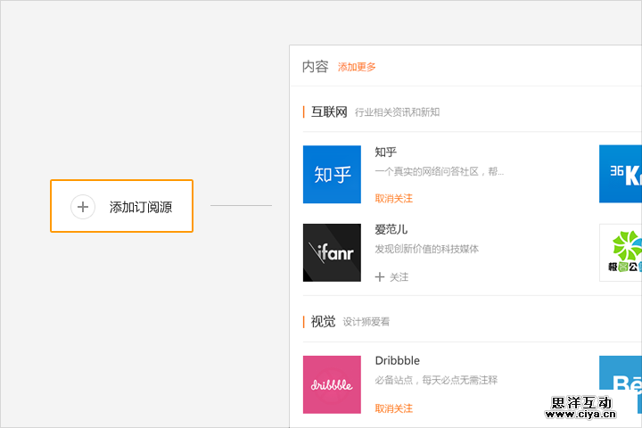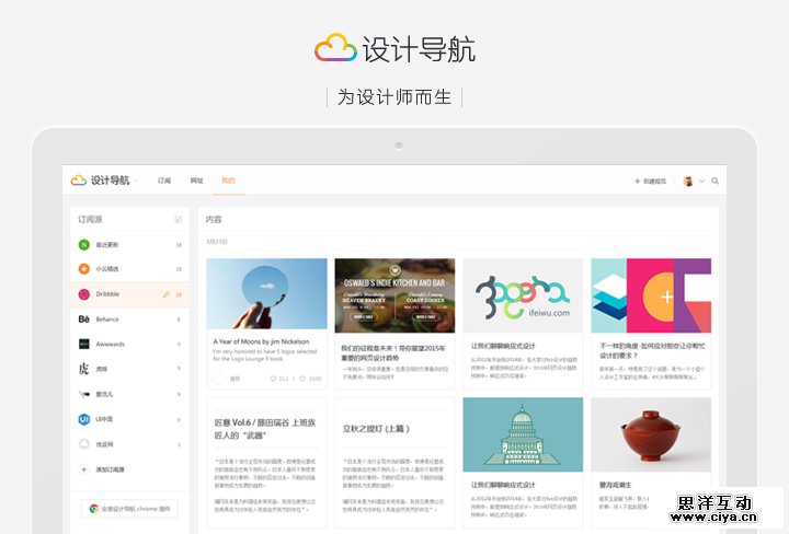 我们参考了RSS阅读器的模式,将设计师经常浏览的各种网站的内容聚合起来,只需要对你感兴趣的站点进行订阅,就能轻松的在设计导航享受一站式的阅读体验了。