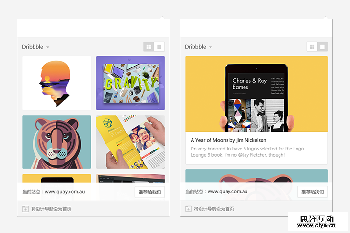 为了更方便的浏览,我们增加了一键将设计导航设为主页的功能,也设计了更为轻便的浏览器插件,不仅可以随时浏览各种设计资讯,还可以把你发现的当前优质站点一键推荐给我们,同时也是对设计导航内容的丰富和沉淀。