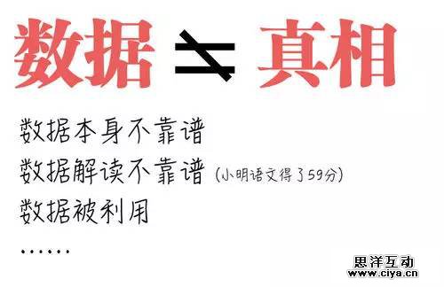 此外,数据的解读,需要保持谨慎批判之心。比如同样是小明语文得了59分,如果你不了解上下文以及历史趋势的话,会认为小明没考好,有的人甚至会得出小明语文不好的结论。而要是了解他上个季度每次语文考试都只有30多分,又会得出小明虽然语文不好但是明显进步了。而要是了解到这个班级平均分数只有49分,你又会觉得小明简直太赞了!所以,单纯的一个数字本身没有任何意义,要窥一斑,更要知全貌。