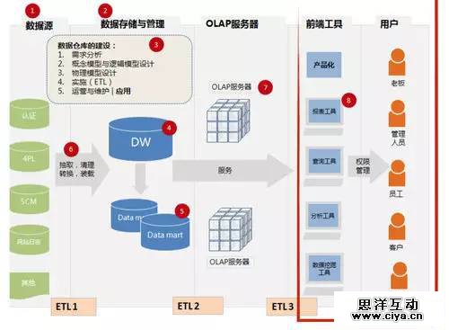 了解 ETL:这个是做数据工作绕不开的术语,E(抽取、清洗)——T(转换)——L(装载),抽取是从各个业务系统中抽取所需的数据,然后完成语义层、逻辑层的转换,比如不同系统中记录销售渠道这个维度,有的叫做 saleschannel,有的叫做 channel,需要转化为同一个概念。装载,也可以理解成抽取、清洗、转换好了,装载到另外一个空间里,供多维查询服务应用调用。