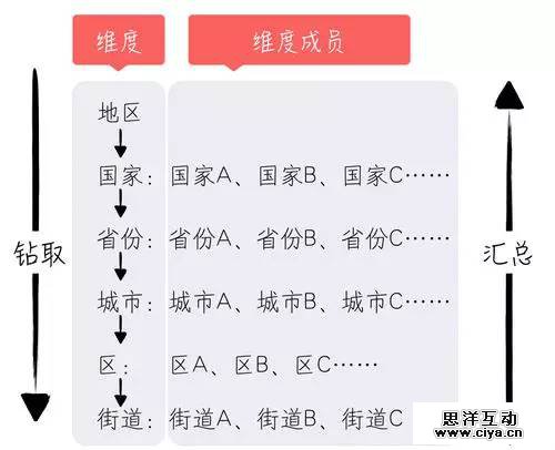 如上图所示,左列也即维度,不管是国家、省份、城市,都是维度,但因为他们有层次关系,所以,有时会被描述为地区维度的不同粒度或层次(明白了吧)。而右侧就是每个维度的维度成员了,有时也被叫成维度值。在可累加的度量中,每一个维度值相加,应该等于上级维度的某成员值总和。比如若城市 A 只有三个区,这三个区的人口总数应该等于城市 A 的。