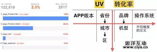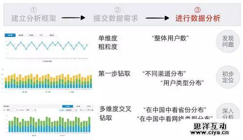 进行数据分析:使用多种维度,进行总体的、细分的、多维的分析,当发现问题时,能够使用这些维度的组合帮助用户找到影响原因。
