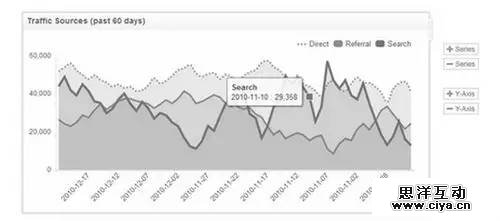 即 Dimension。指我们平时看事物的角度。比如,同样是网站浏览次数(PV),我们可以从日期角度去看,也可以以流量来源去看(来自直接访问的、来自微博的、来自搜索的等),也可以以新老用户分群来看。更多的场景是同时以两个维度的组合去看,比如这样的图,就是同时结合了时间、来源两个维度对网站流量进行分析: