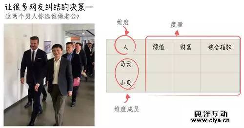 当时小贝和马云一碰面,无论在阿里还是网络上,都出现了一个两难的问题:到底是选谁当老公呢?(能有这个问题的妹子,你真想多了……),其实这里仔细分析,无非也是涉及到维度和度量两词: