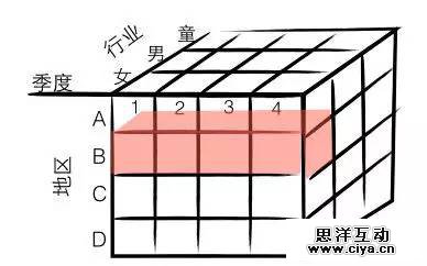 这只是切块。我们还可以切片,比如我想要知道B地区所有行业的四个季度的成交总和,怎么切?我想要知道男装行业所有地区四个季度的成交总和怎么切?