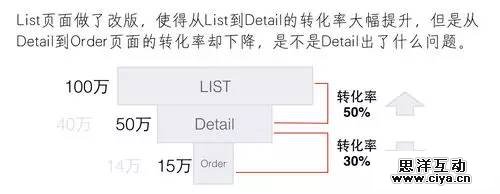 某日,负责搜索结果页(LIST)的设计师来找商品详情页(Detail),他好容易做了 LIST 页面的改版,而且结果也确实喜人,从 List 页面到 Detailye 页面的转化率确实提升了(比如原来100万的人来到 List 页面,只有40万继续点击到 Detail,改版后,变成了50万)。但是不幸的是,总体从L到订单的转化率却没有提升,反而下降了。