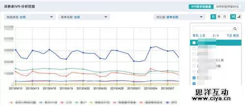 如,在分析客户来电的自动语音导航服务中,我们就可以按不同的维度去对比看用户在导航菜单里按键量,下图所示是“按菜单对比”的界面,在“对比按”中可以进行切换其他对比视角。