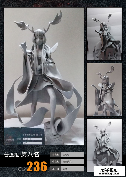 角变成羽衣这一点极具原创性。垂下的羽衣在构图下方汇集,这一点很可惜。前后再增加一点变换将会更有动感也更轻盈。虽然和作品制作没有直接关系,但摄影很吃亏。参照其他选手的图像,学习一下摄影吧。