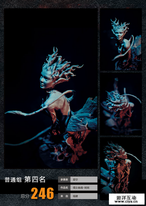 作品本体和底座结构流程,很有美感。 人体和漂流木材融合自然,表现出色。 照片中的蓝色光线营造出梦幻的氛围,让人印象深刻。