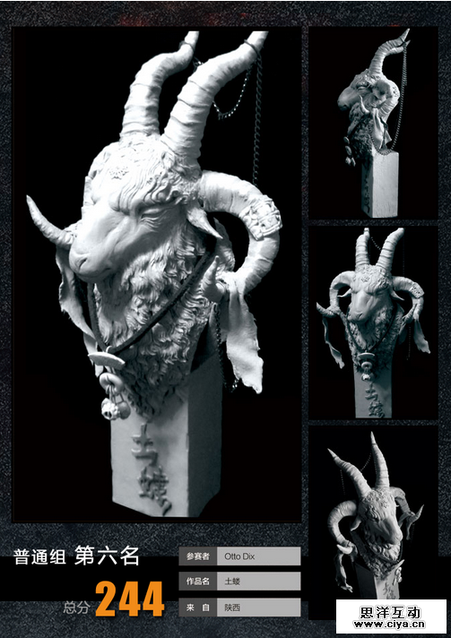 半身像和底座的平衡很好,很漂亮。头部的皮肤、角的质感、毛发的表现,强弱变化丰富。羊角上使用了其他材质的锁链,起到了很好的点缀作用。我个人非常喜欢这个作品。