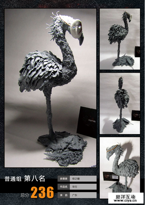 主题是将多种鸟类的复合体,头上的面具令人印象深刻。一动不动的造型更增添了神秘感,面具另一侧忧伤的脸庞更是突出。不同部位的羽毛质感还有变化这一点令人佩服。