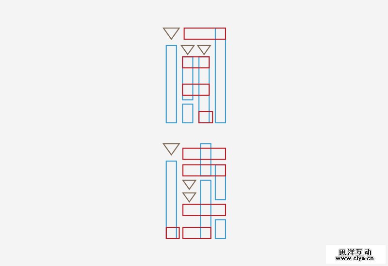 02. 做中文字体搭建。图中红色笔画部分为西文原字母,蓝色笔画部分是经修改或局部截取的西文字母。