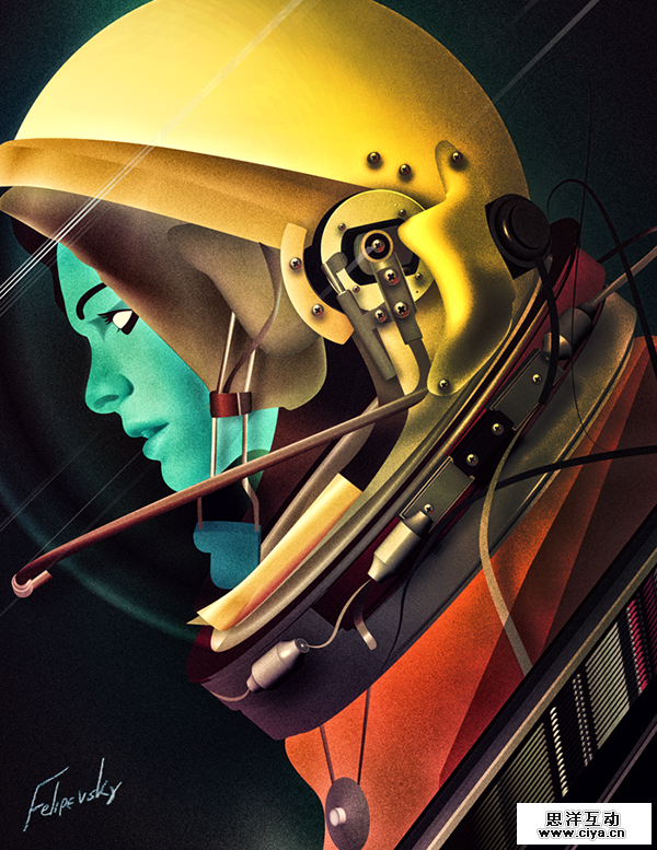 ↑接下来,有请矢量图形设计软件Ai妹纸,作为PS的胞妹,她也是深受设计师们喜爱的常用神器之一,而且论出身,她才是最正宗的Adobe产品,所谓根正苗红了,不像PS还是收购而来滴。最新版AI的启动画面是个科幻感强烈的妹纸,难道灵感来自“女绿巨人”不成,哈哈。那它的作者是智利艺术家Felipe Vargas,原作是竖向的图哦。