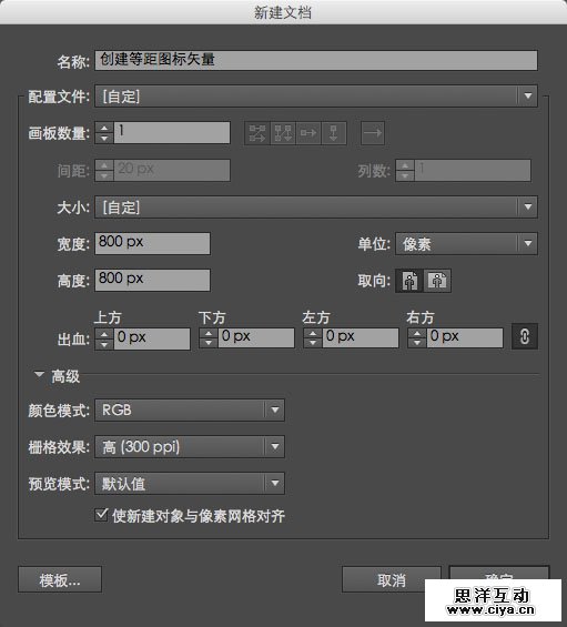 打开Adobe Illustrator创建一个新文档( 命令/按Ctrl + N/Com+N) 画板800*800 RGB模式