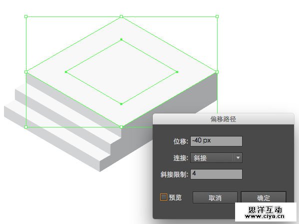 我们着手于墙壁的创建.选择基础的顶面,然后去对象>路径>偏移路径…并设置适当的值(-30px在我的情况下).