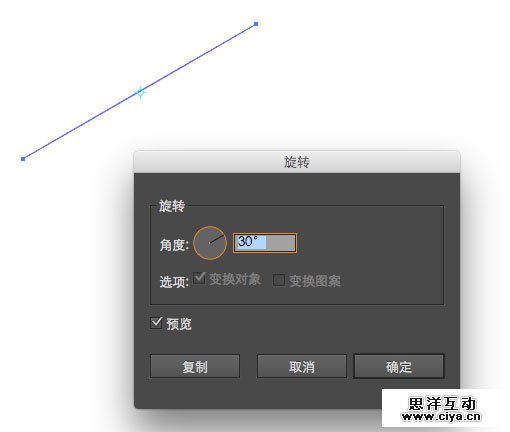 创建2个倾斜的导向,也将有助于我们在进一步的设计.使用直线工具绘制一个水平线段(\).现在去对象>变换>旋转...并在对话框中设置一个30度角.