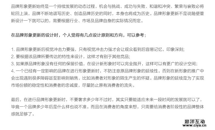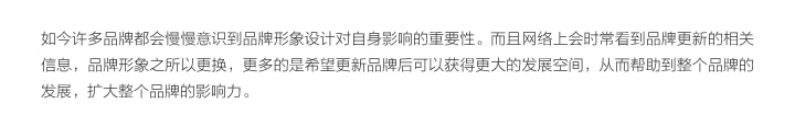 如今许多品牌都会慢慢意识到品牌形象设计对自身的影响的重要性。而且网络上会时常看到品牌更新的相关信息,品牌形象之所以更换,更多的是希望新品牌后可以获得更大的发展空间,从而帮助到整个品牌的发展,扩大整个品牌的影响力。