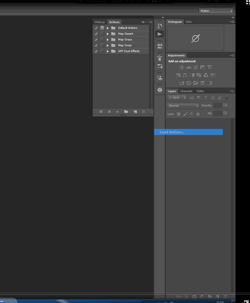 载入动作,在ps中打开动作面板(默认快捷键“Alt+F9”)点击动作面板右上角的“小三角”选择“Load Actions”,载入你下载的PS动作。
