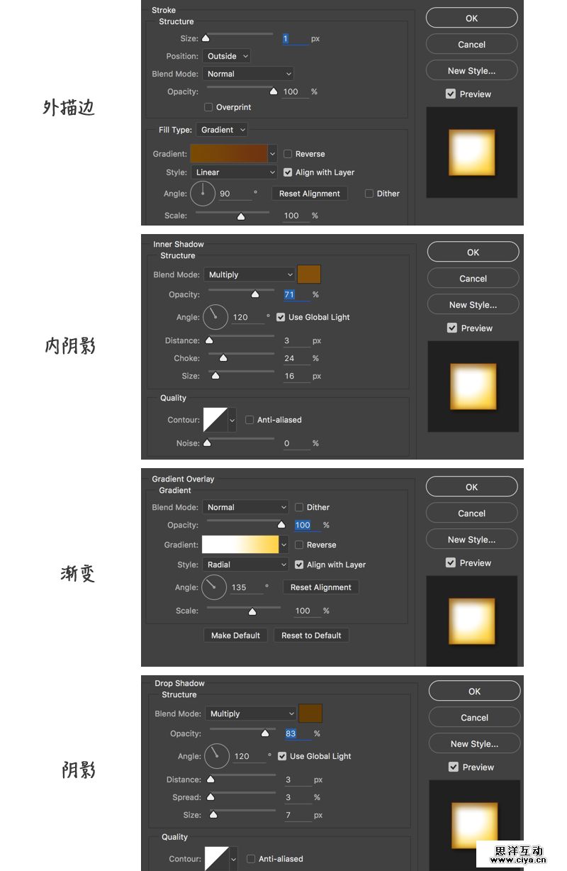 对圆形添加图层样式,分别是外描边、内阴影、渐变填充、阴影。具体设置如图: