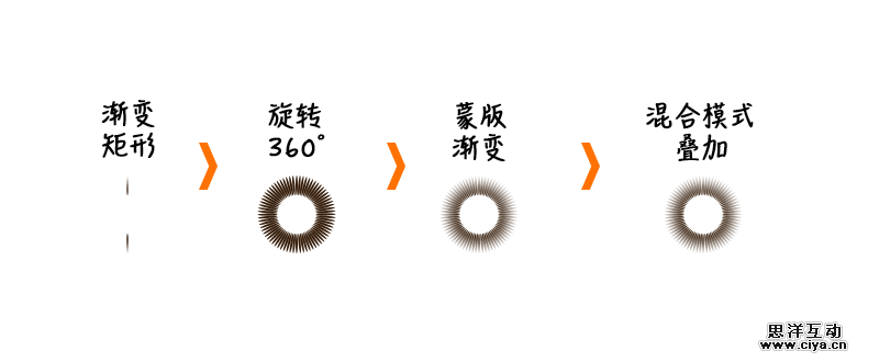 眼睛内部的纹理。新建两个矩形,填充为#45270b,然后旋转360°。添加蒙版,放射渐变(外虚内实)。最后将混合模式选为叠加。将纹理图层放在黑色瞳孔图层下面,如图所示: