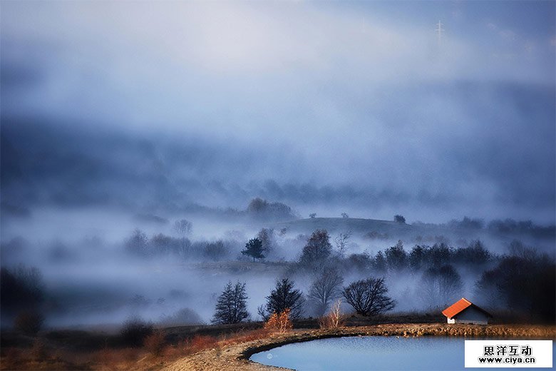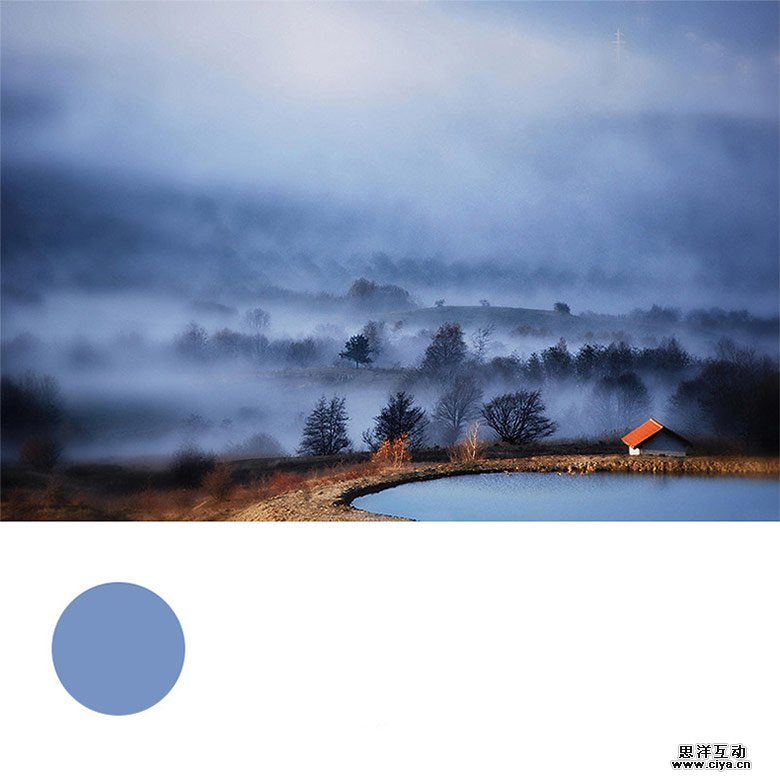 主色调的选择依据整个图像当中分布最广的一种颜色,在这张图片中,我们可以看出分布最广的为蓝色,这些蓝色呈现明暗层次深浅的不同,因此,在深蓝到浅蓝中我选择了过渡最为均衡的一种中度灰的蓝色。这种蓝色在图片上表现的是一团团云雾和湖泊的颜色。