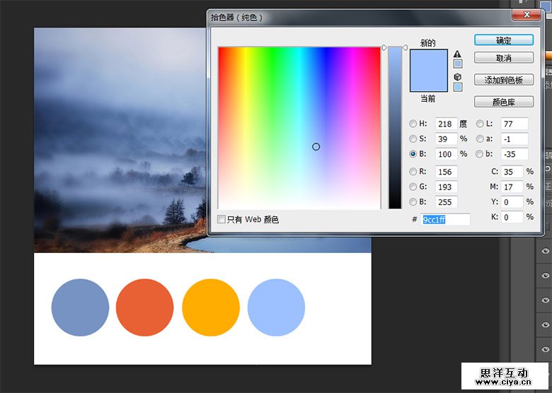 选择新建一个文件,白色底背景,图片中选好的色彩作为前景色画一个圆形。这个圆形也就是你的色彩方案中的第一个色彩:主色调。